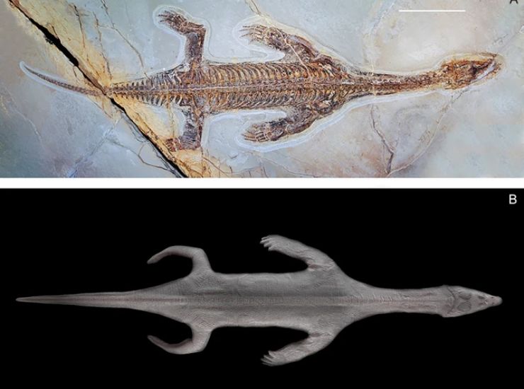 Il nuovo esemplare, custodito al Museo cantonale di storia naturale di Lugano, è quasi completo e si presenta in ottimo stato di conservazione, con un profilo corporeo che per la prima volta rivela dettagli inaspettati. La pelle, fossilizzata come una sottile pellicola carboniosa, delinea chiaramente le mani e i piedi palmati: non vere e proprie pinne, ma arti con dita ben visibili unite da membrane.