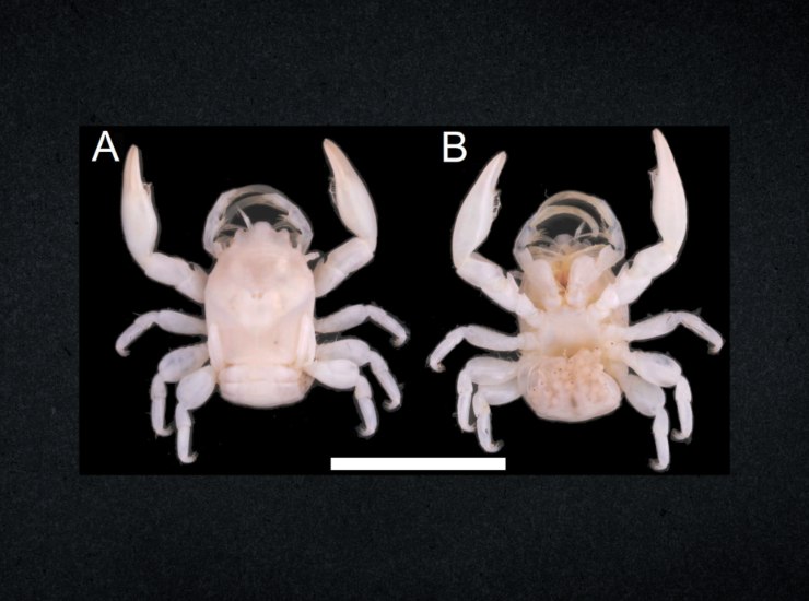 Accanto allo squalo lanterna, un’altra scoperta ha attirato l’attenzione degli zoologi: un granchio porcellana di appena 15 millimetri. Il nuovo arrivato, Porcellanella brevidentata, vive in simbiosi con i coralli “penna di mare”, minuscoli organismi bianchi che si agitano dolcemente nelle correnti profonde. Il colore pallido e opalescente del granchio lo rende praticamente invisibile nel suo habitat: un piccolo fantasma del mare che preferisce restare nascosto tra le “foglie” del suo ospite. A differenza dei granchi più comuni, questo non usa le chele per afferrare il cibo.